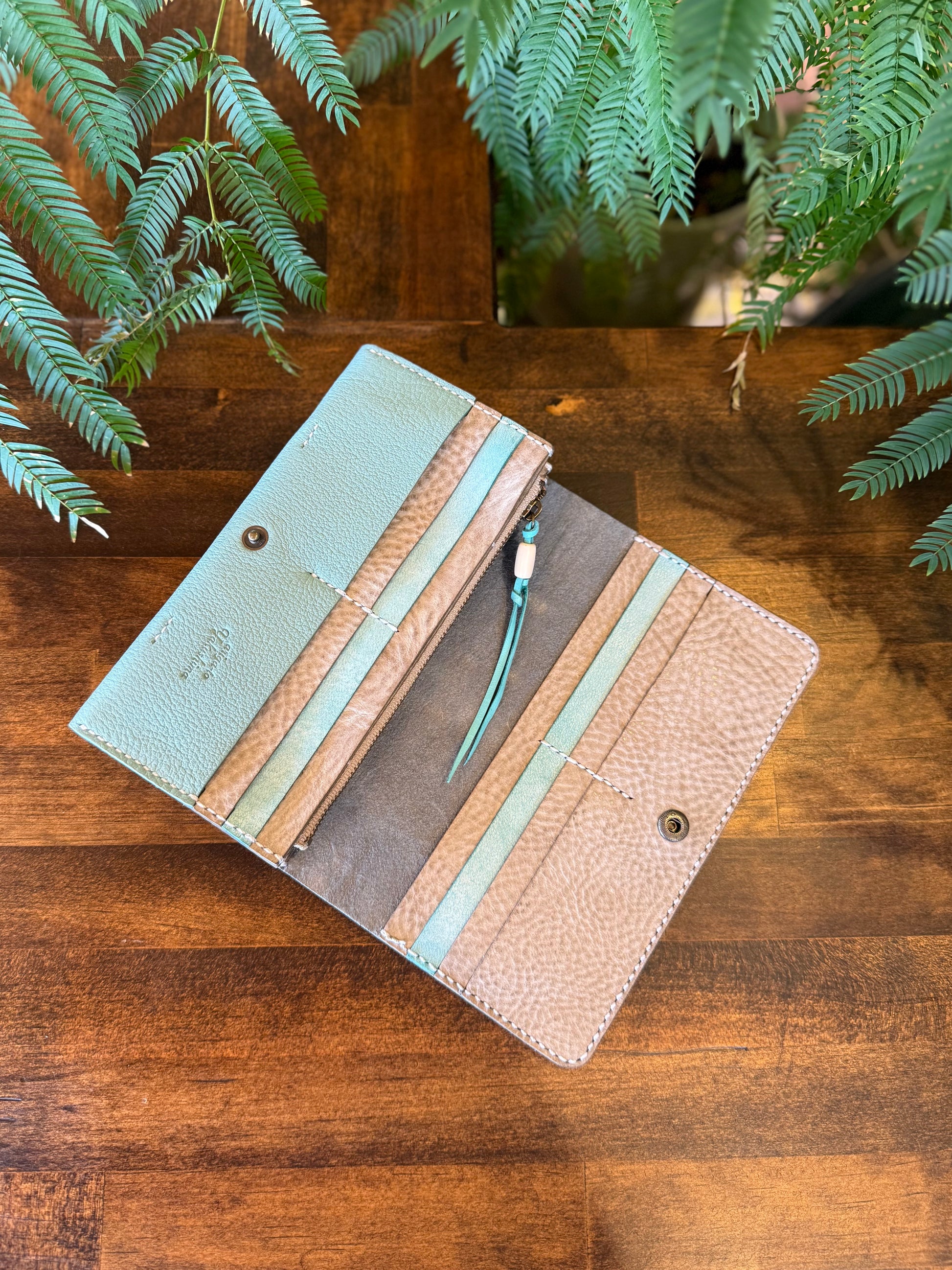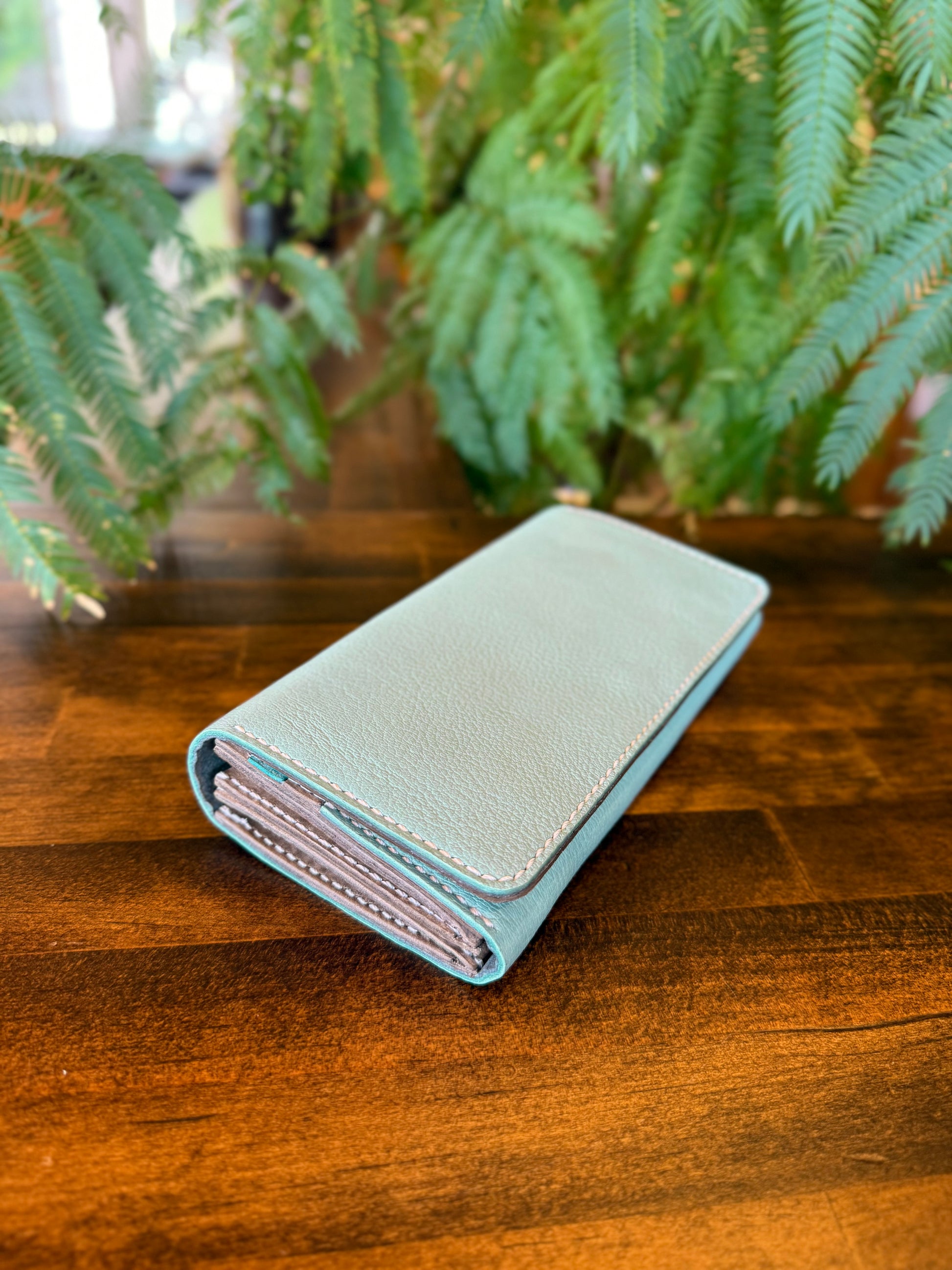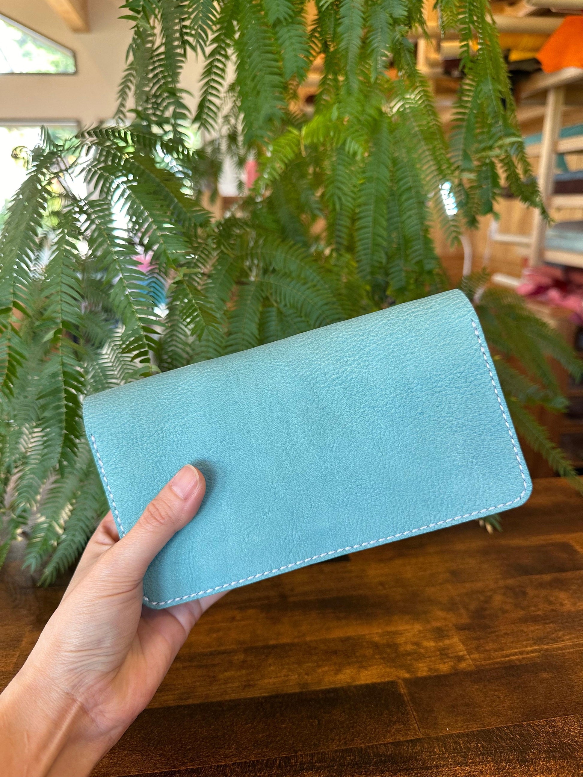 The outer leather is made from Yakushima deer leather dyed turquoise.
