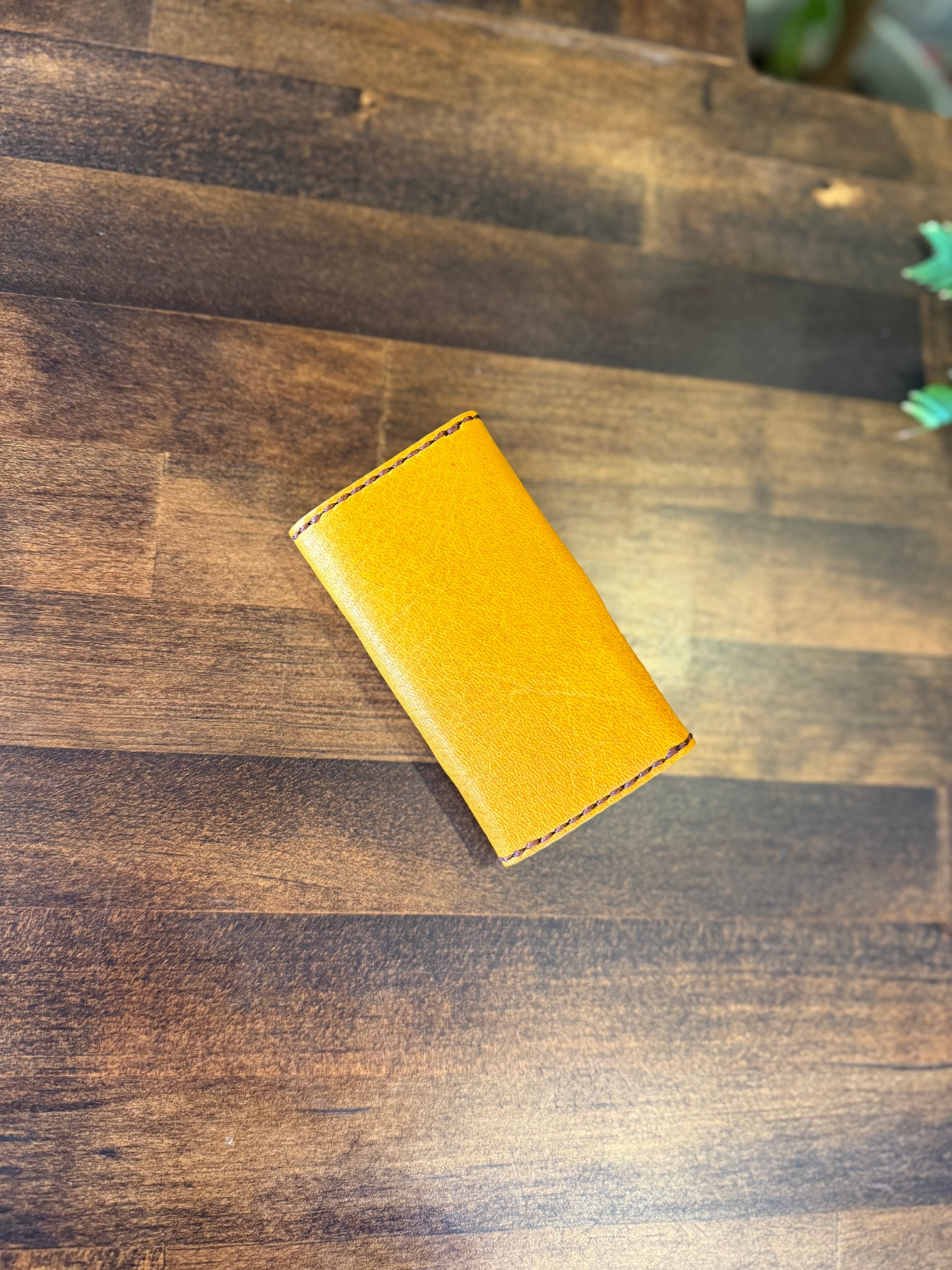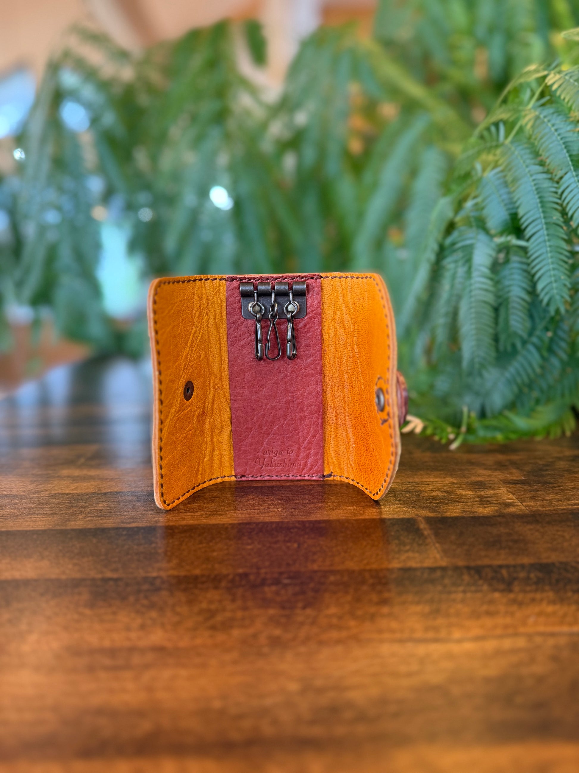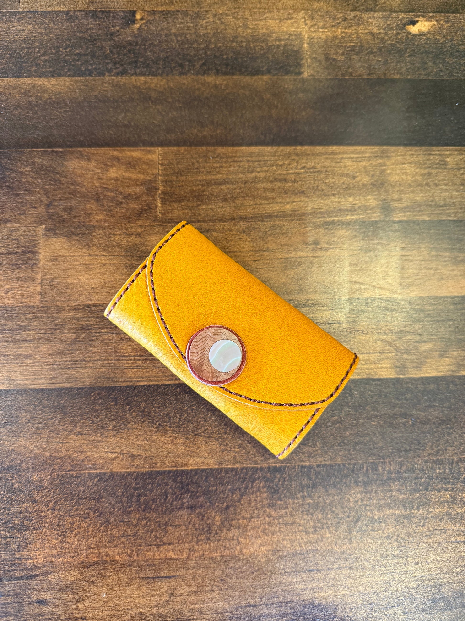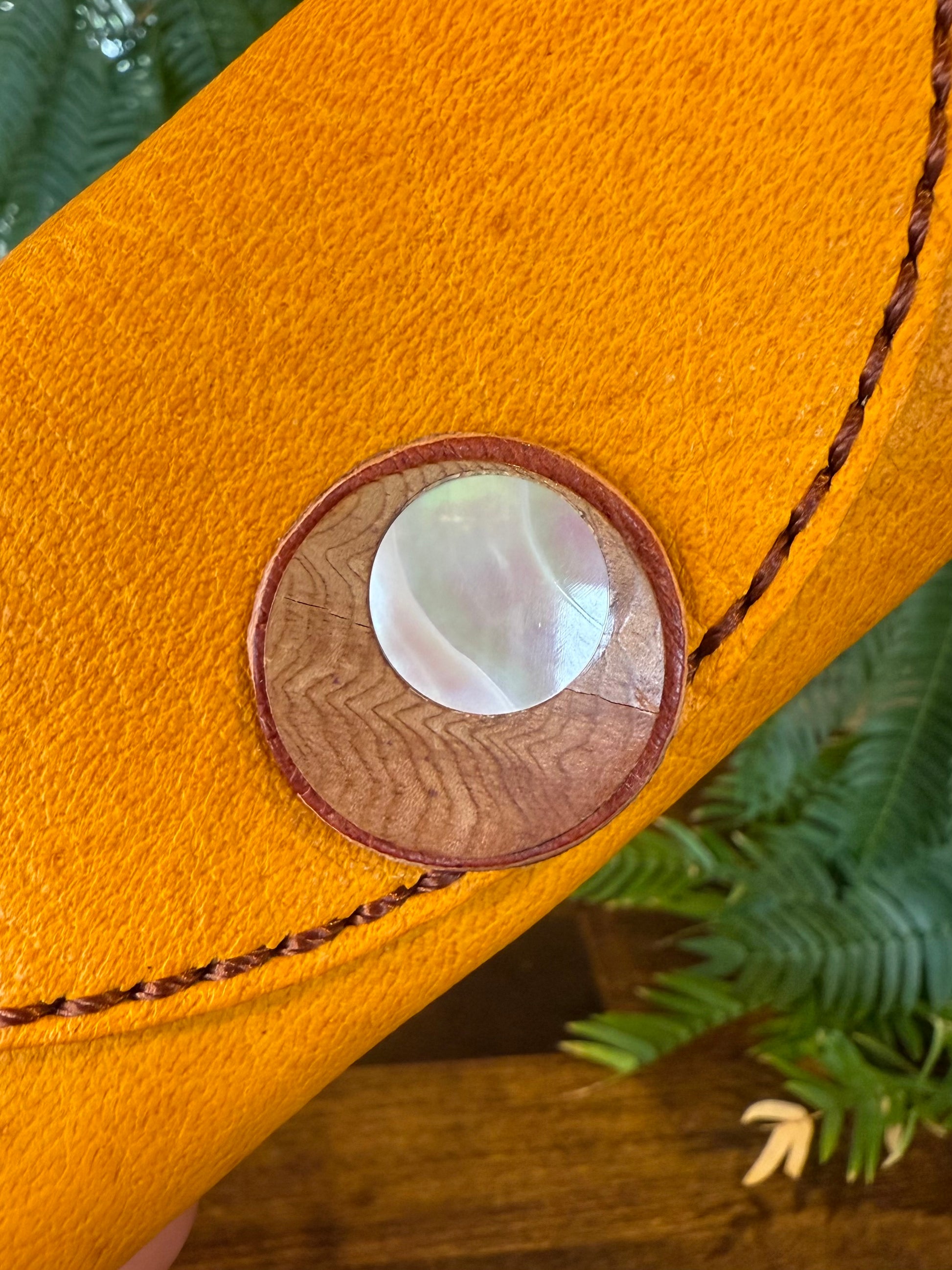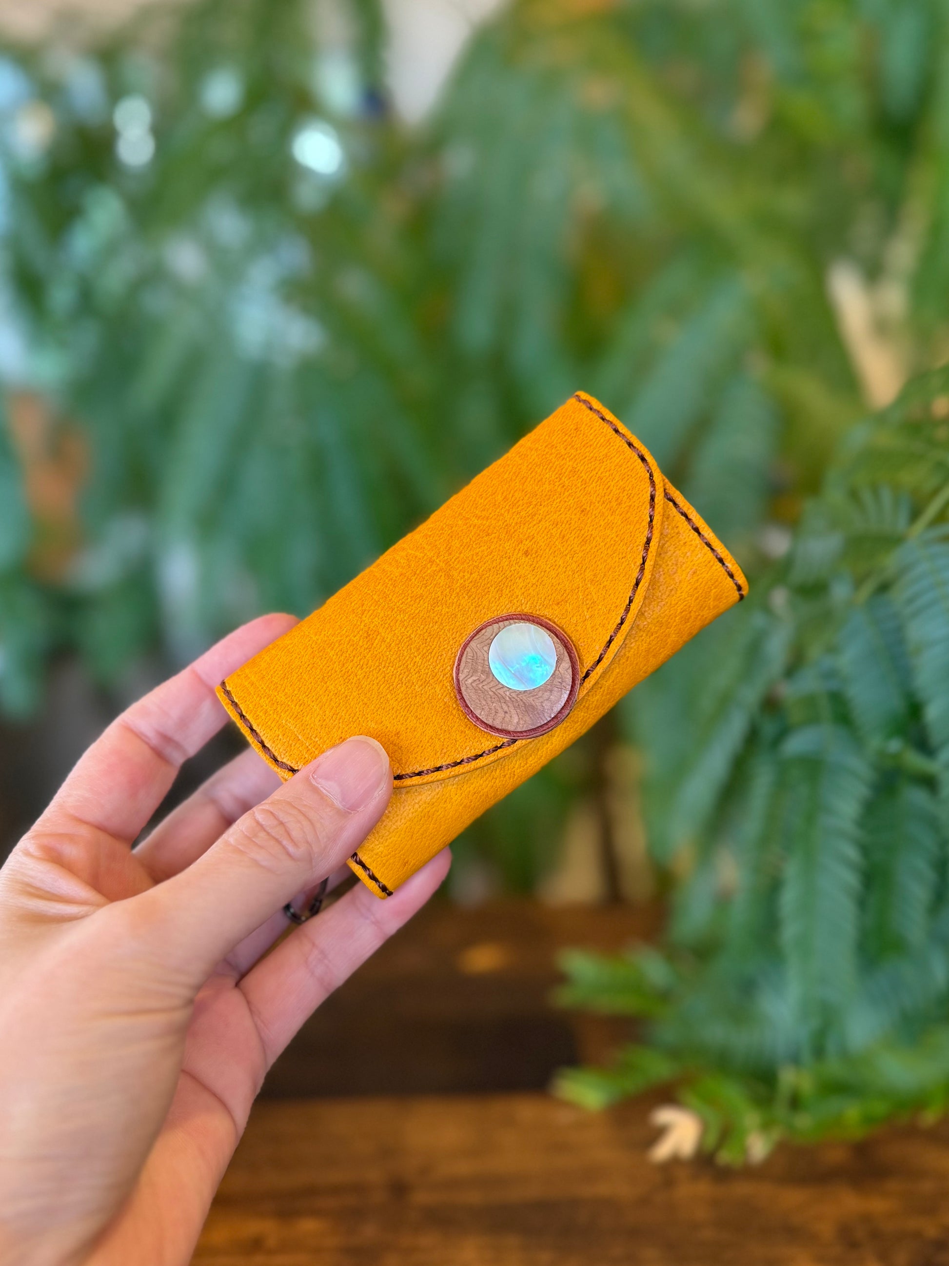 屋久鹿革のイエローと煉瓦色のころんとまぁるいキーケースに、屋久杉と夜光貝でお作りした飾りボタンを添えました。