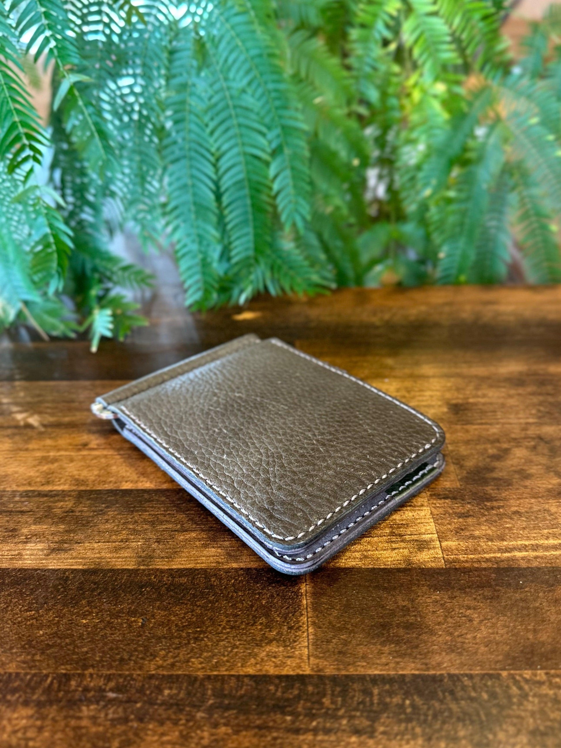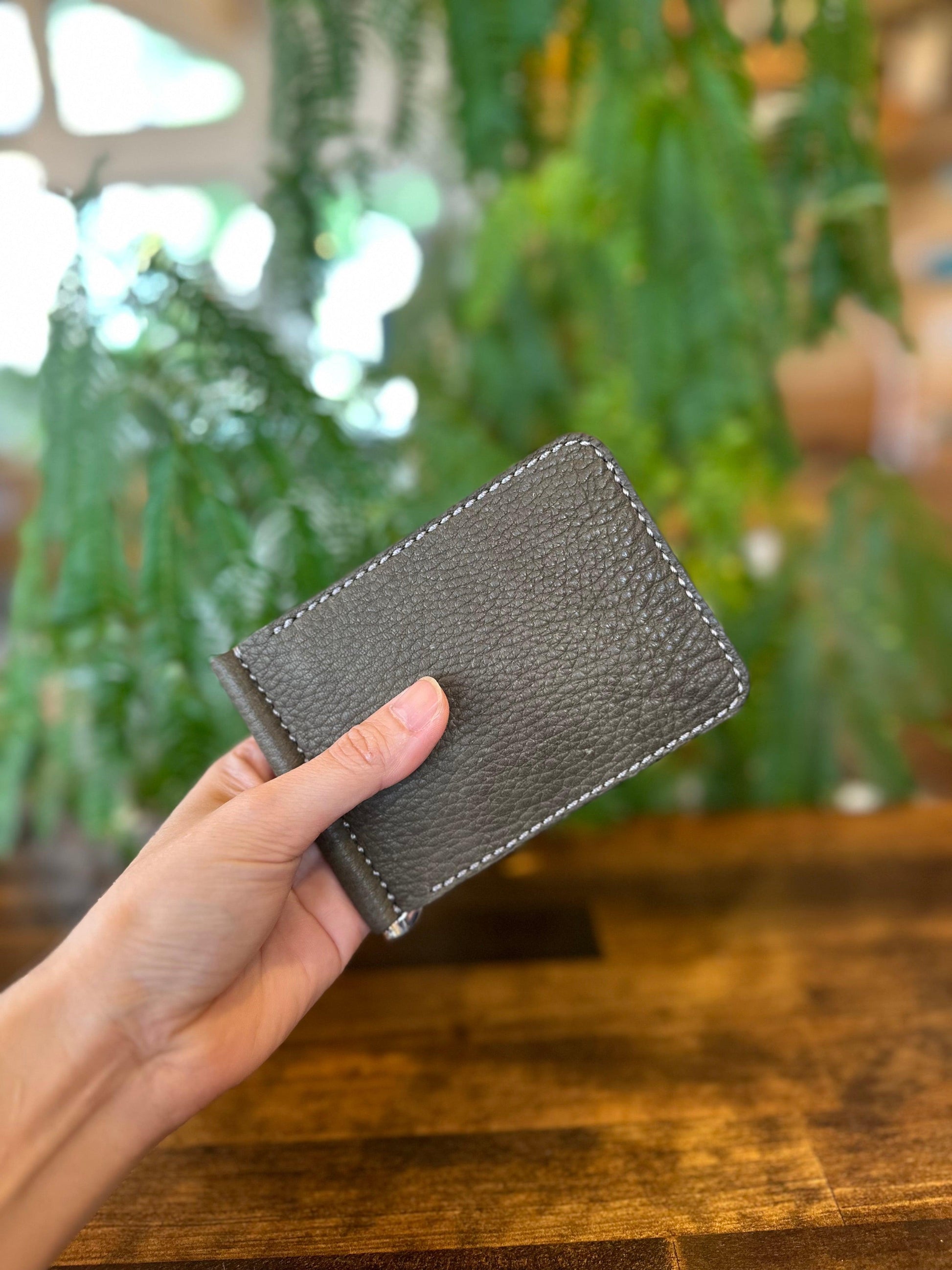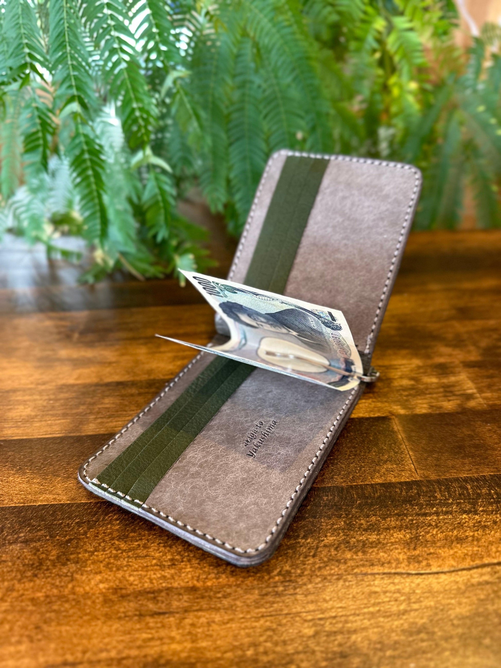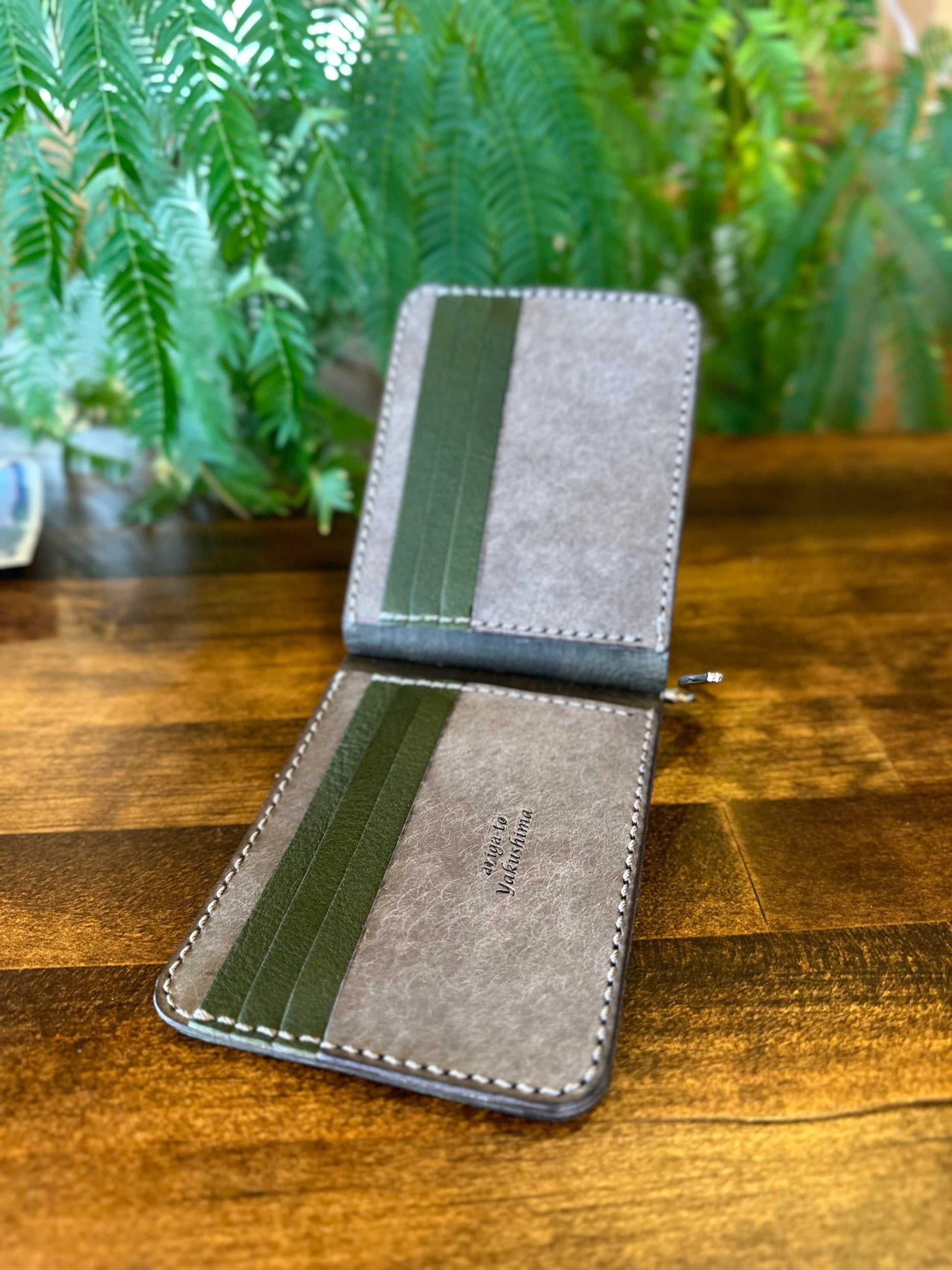 表の革には屋久島に生息する屋久鹿の革をグリーンに染めた革を使用