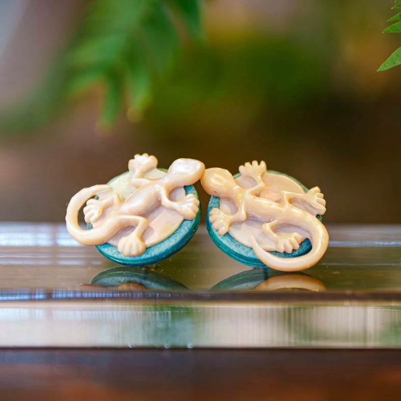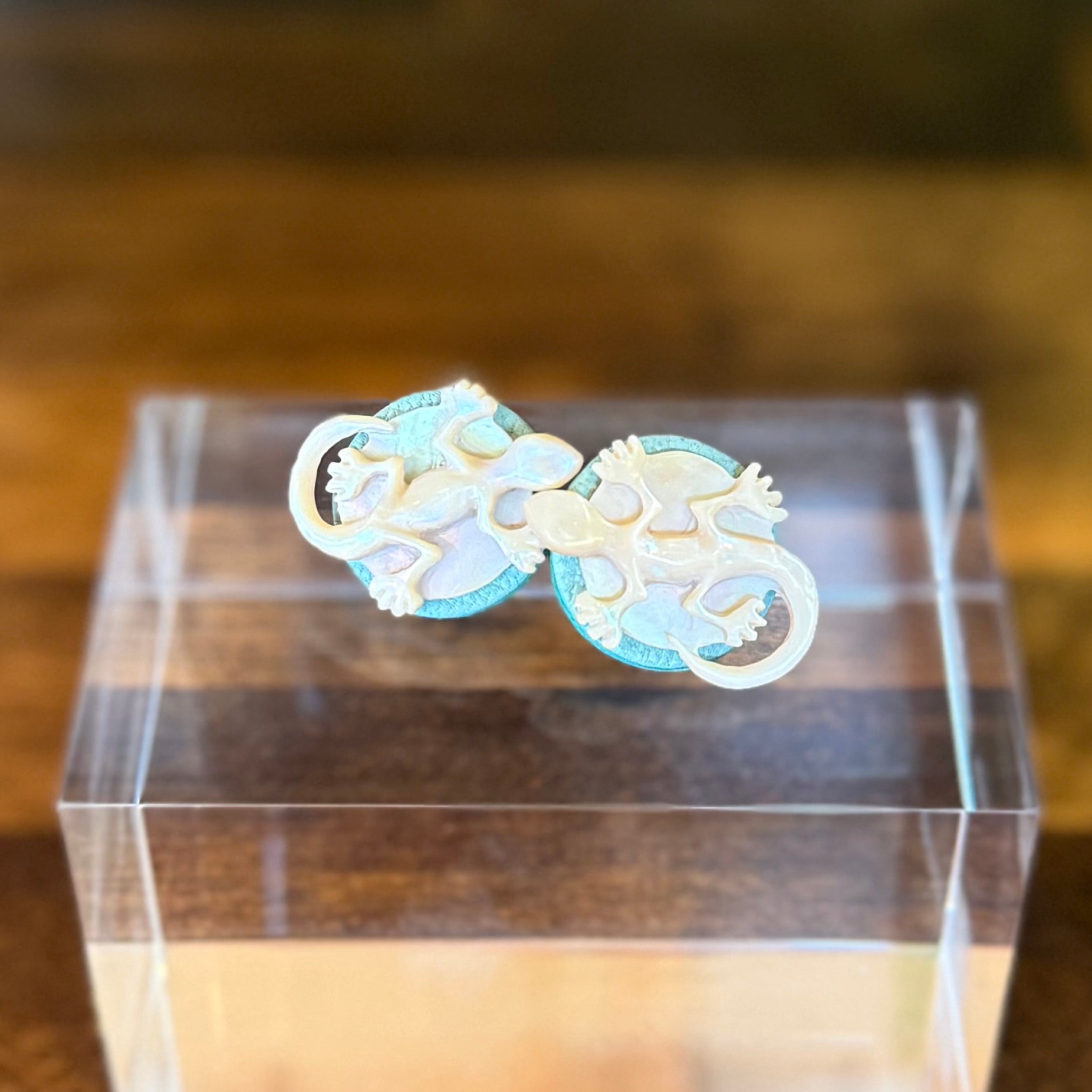 夜光貝のヤモリ…土台の丸い部位が直径17mm(ヤモさんはそこからはみ出ています)