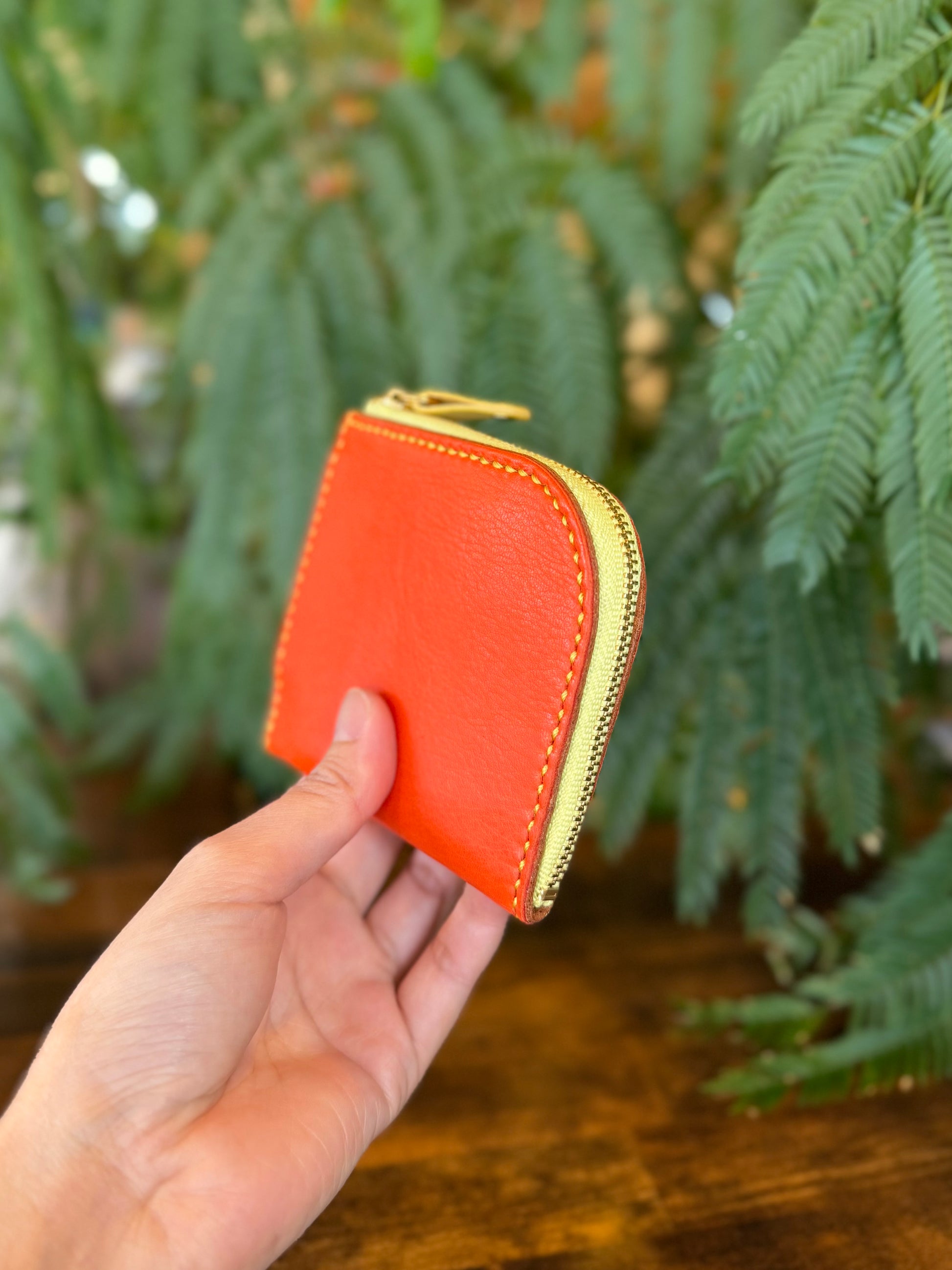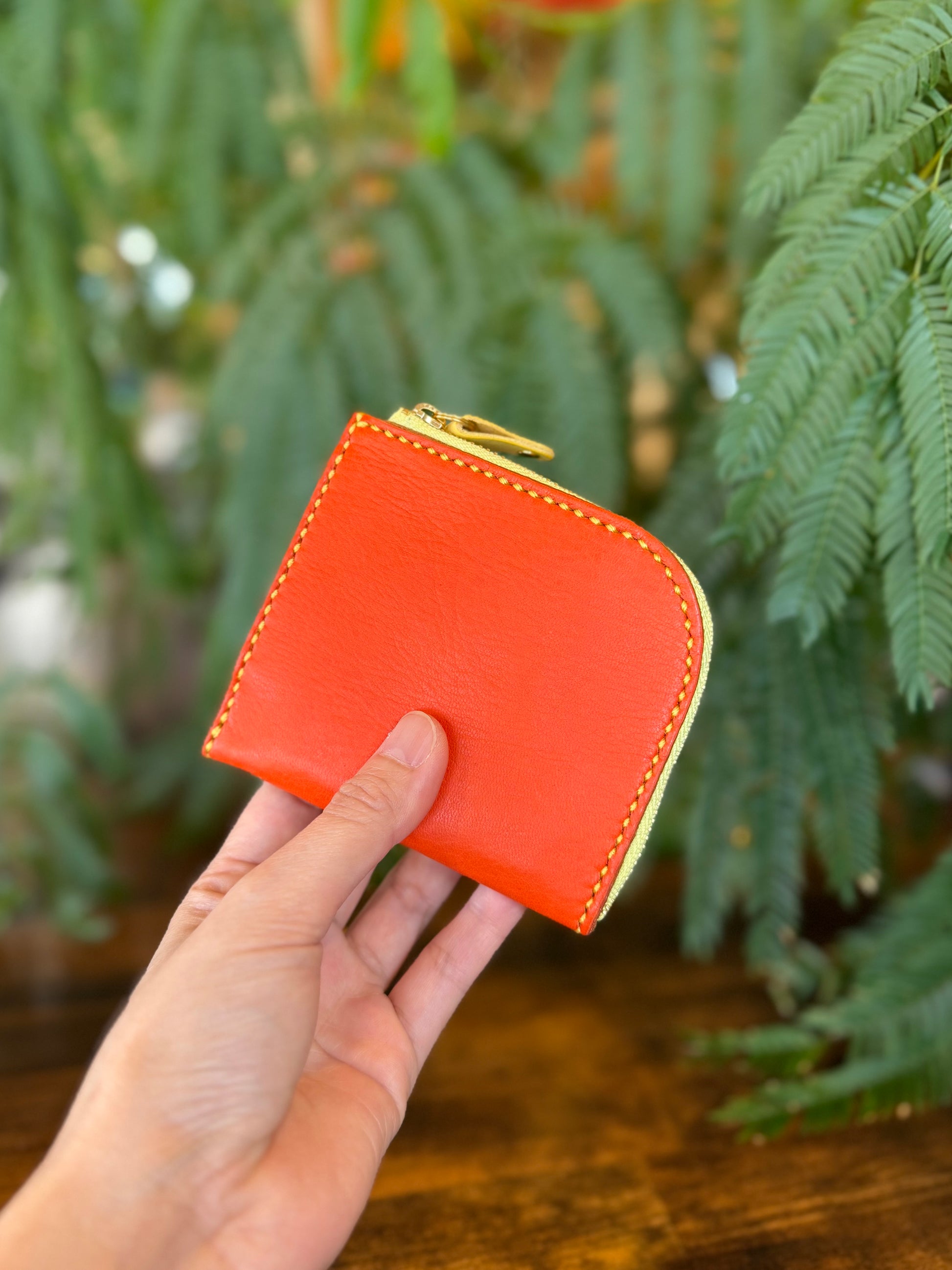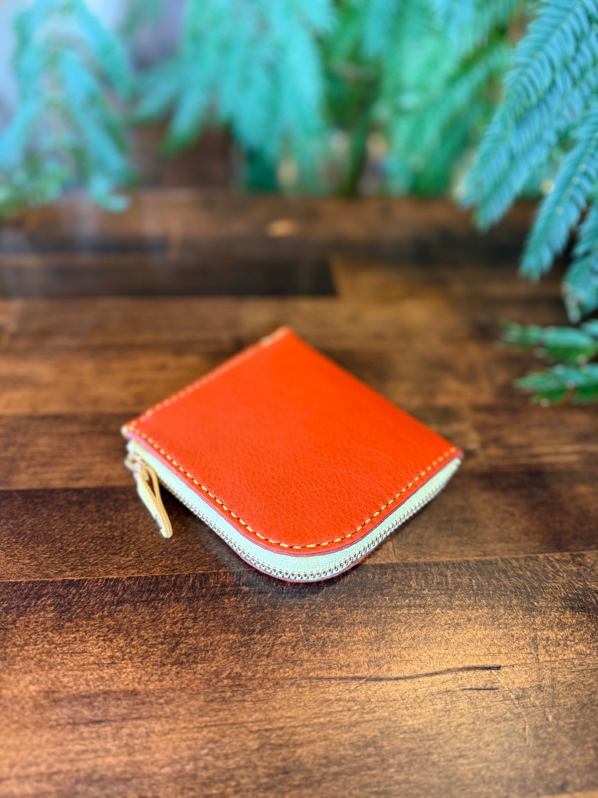 ※ツワブキの飾りボタンが付いているお財布と付いていないお財布はロットが異なるため、オレンジの色味か異なります。
